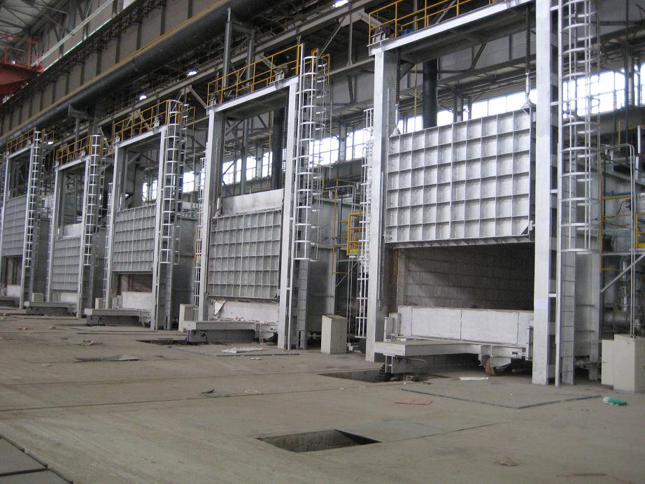 鋁合金淬火爐適用于對大、中型鋁合金產品零部件的固溶熱處理及時效處理,由加熱爐罩和移動式底架組成的。方形(或圓形)爐罩頂裝有起重機,通過鏈條和掛鉤可將料筐吊至爐膛。爐罩由型鋼支起,底部有氣動(或電動)操作的爐門。位于爐罩下方的底架可沿軌道移動、定位,底架上面載有淬火水槽和料筐等。